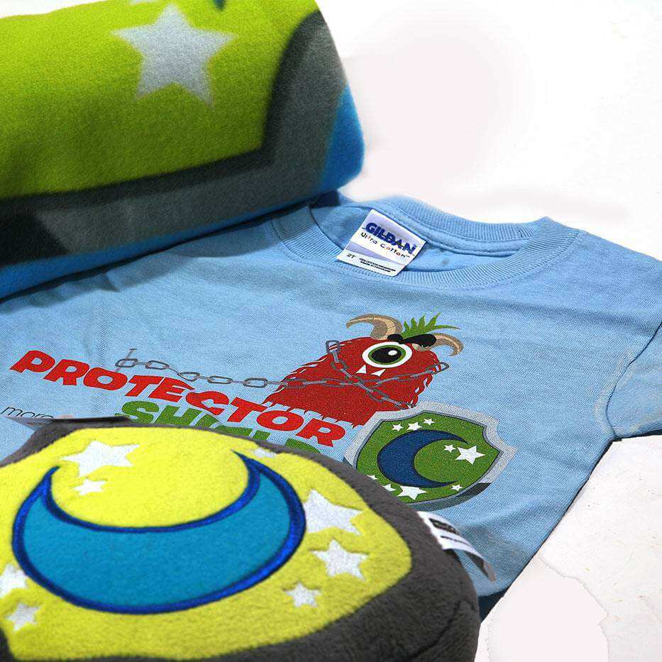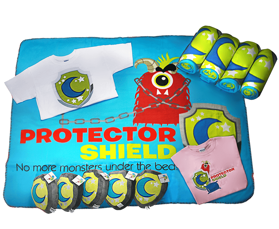 Parents! All you need to do is order one or all of our special products developed by highly trained wizards at Protector Shield headquarters and give it to your child to sleep with! Wrap your child in our super cozy blanket with the Protector Shield logo or put your loved one in one of our logo t-shirts! But the best protection of all will be our stuffed shield. Take the shield anywhere! Not only is it great to snuggle with, you can get rid of monsters by putting it in your closet, under the bed, in the bathroom, or anywhere monsters may try and hide. Stay protected!